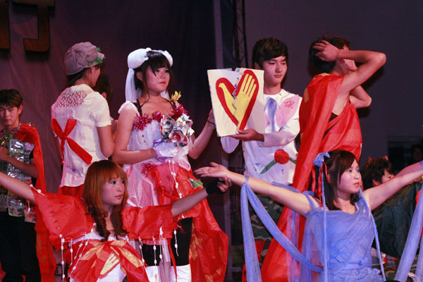晚会浓墨重彩的一笔当数“环保时装秀”。青年志愿者协会环保社本着“环保先锋,时尚达人”的主题,为观众们表演了新颖奇特又独具含义的T台走秀,废弃的旧物也可以“变废为宝”,大到军训服、废弃横幅、蚊帐,小到矿泉水瓶盖,光碟报纸等都可以成为环保这社成员服装秀上的亮点。在表演过程中,模特们手持横幅向观众们传递环保理念,以情景的方式提醒人们勿采摘花朵、勿随意扔垃圾和坚持低碳生活,使观众们直白简单地理解他们想表达的意思。