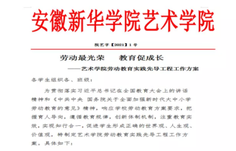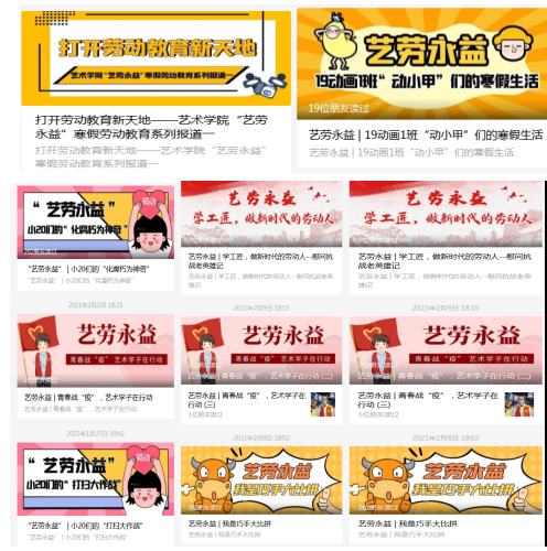 在2020年寒假,艺术学院官微“新华艺院”以“艺劳永益”为主题的推文近20余篇,多篇得到校团委官微转发,通过宣传进一步加强劳动教育的成果展示,提升和深化劳动教育效果,深化劳动内涵,教育引导他们学会劳动、学会勤俭、学会感恩、学会助人,立志成长为德智体美劳全面发展的社会主义建设者和接班人。