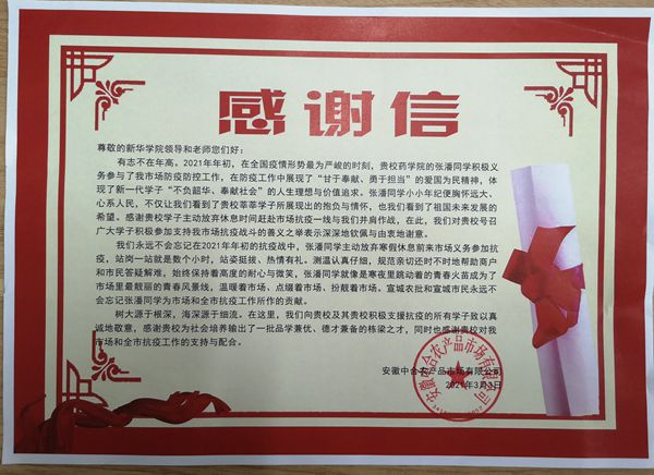 本网讯(通讯员:赵影、张然)2021年年初,全国疫情形势依旧刻不容缓的情况下,pp电子药学院2019级药品经营与管理专业学子张潘积极参与一线防疫防控工作,被当地抗疫一线新闻报道。近日,安徽中合农产品市场有限公司给学校寄来了真挚的感谢信。