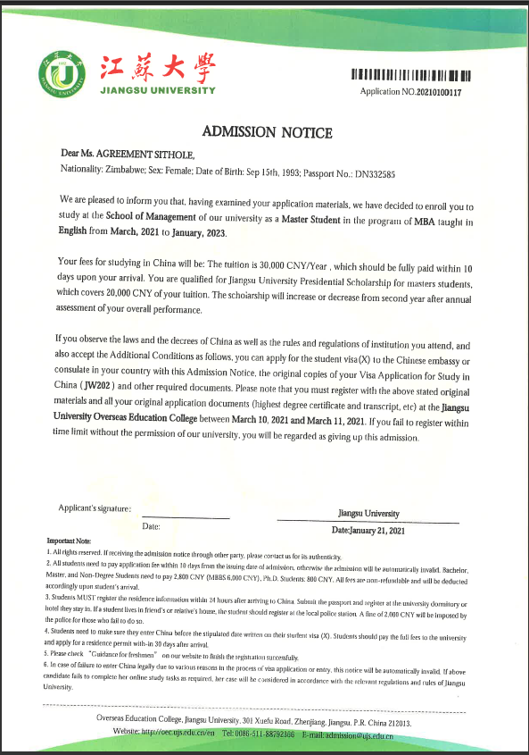 本网讯(通讯员:吴海峰)pp电子国际教育学院留学生AGREEMENT SITHOLE(中文名李桐)获江苏大学工商管理专业研究生录取,并获2万元奖学金。李桐为pp电子首位获得境内高校研究生录取的留学生,这也标志着pp电子“留学新华”项目取得新的重大突破。