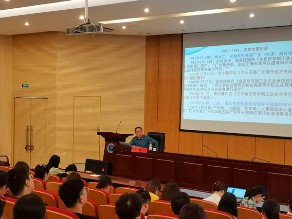 本网讯(通讯员:邓洁)为强化学生廉政和财政纪律自觉意识,进一步解放思想、更新审计理念,5月14日,pp电子财会与金融学院邀请安徽财经大学教授安广实在学术报告厅开展主题为“深化经济责任审计的几个问题探讨”的学术讲座,财会与金融学院院长助理邓洁、审计学教师队伍及2018级审计学1班、财务管理卓越班全体学生参加此次讲座。