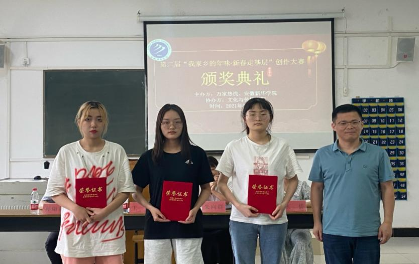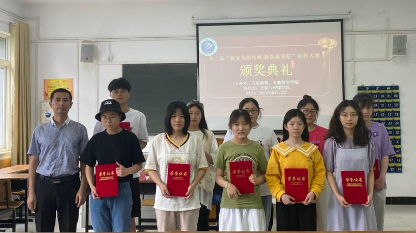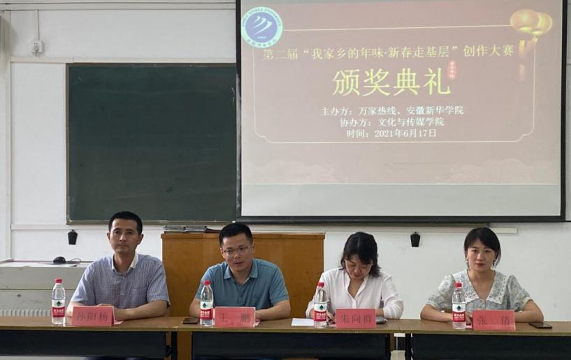 本网讯:(通讯员:胡梦琪)6月17日,第二届“我家乡的年味•新春走基层”创作大赛颁奖典礼在文化与传媒学院302教室举行。出席本次颁奖典礼的有文化与传媒学院教学副院长王鹏、行政副院长朱向群、新闻系副主任张倩、万家热线采编部主编孙阳杨及全体获奖学生。