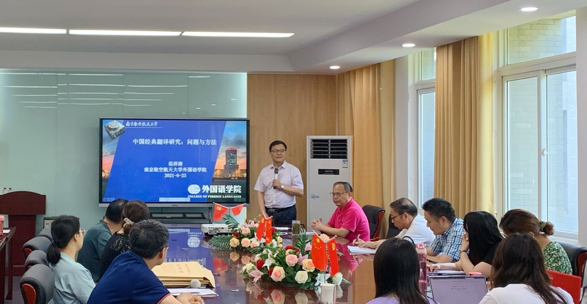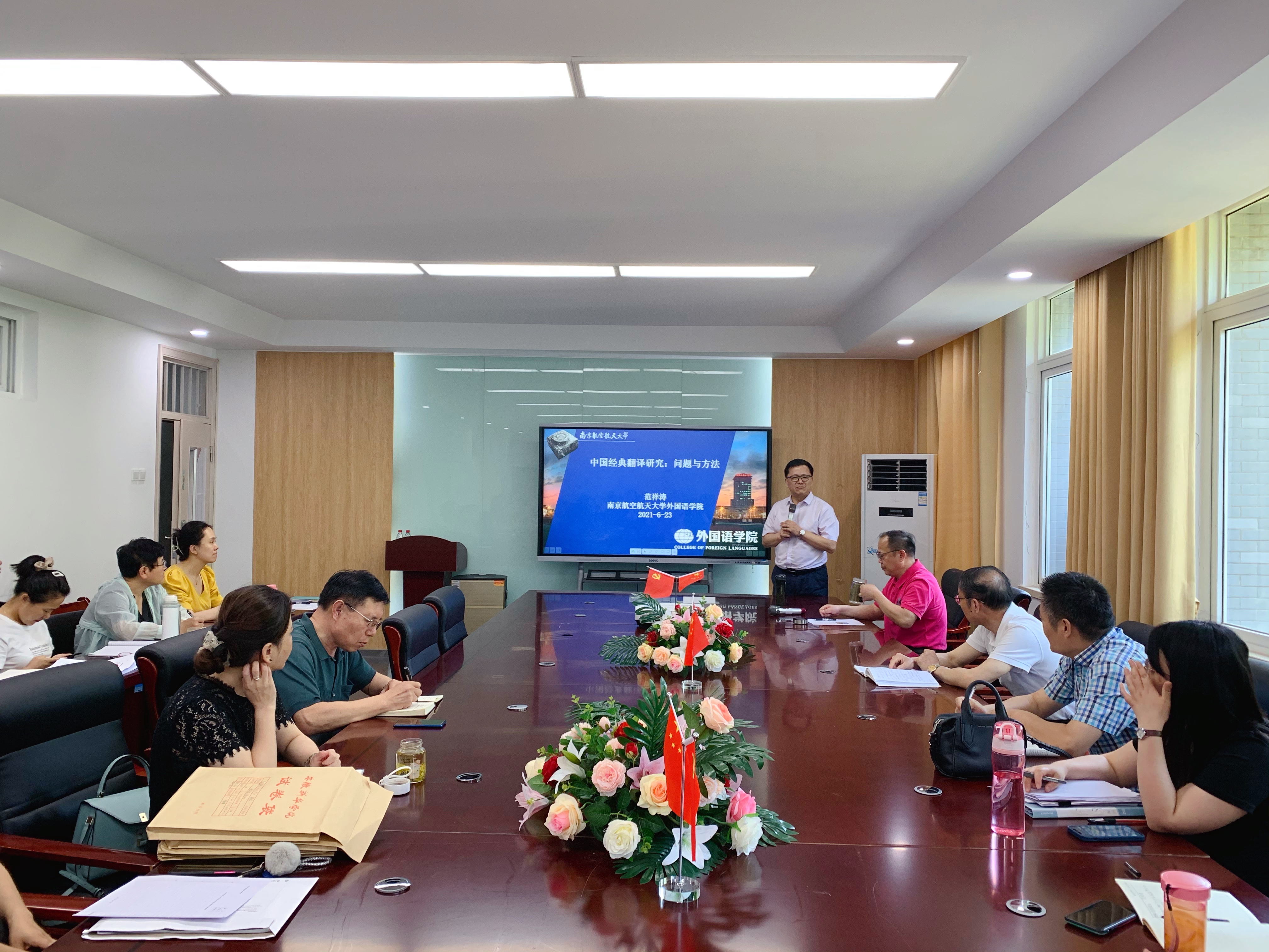 本网讯(通讯员:佘月月,李怡嘉)6月23日,应pp电子外国语学院邀请,南京航空航天大学外国语学院院长范祥涛教授来pp电子作主题为“中国经典翻译研究:问题与方法”和“ 国家项目申报说略”两场学术讲座。学科带头人周平教授主持本次讲座。外国语学院全体教师聆听讲座。
