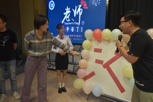 在教师节礼品卡发放和游戏环节中。教师们依次上台抽奖并进行即兴表演,全场在欢声笑语中落下帷幕。