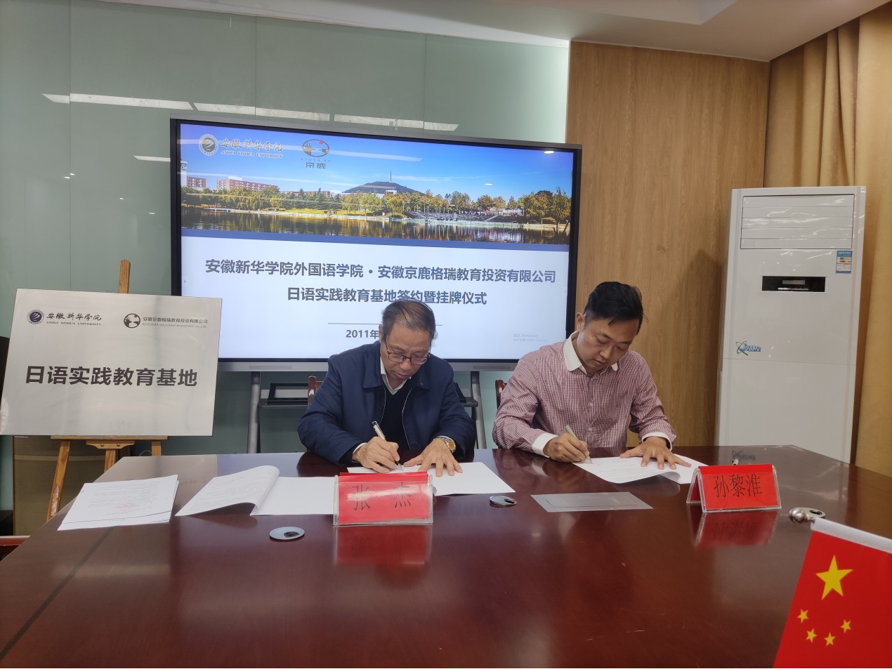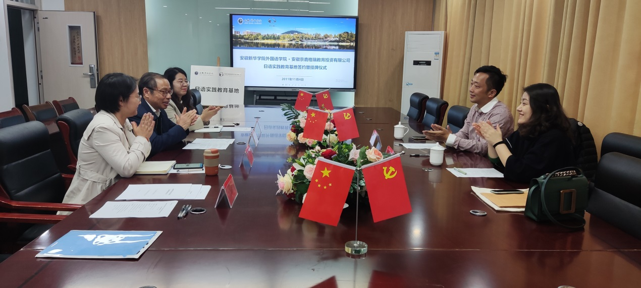 本网讯(通讯员:黄亚萌)为进一步拓宽校企合作广度,推动日语专业人才实习和就业工作良好发展,11月4日下午,外国语学院与安徽京鹿格瑞教育投资有限公司日语实践教育基地签约暨挂牌仪式在教10-324会议室正式举行。安徽京鹿格瑞教育投资有限公司董事长孙黎淮、教学部主任刘玥焜、外国语学院院长张杰、院长助理陈丽、院长助理李怡嘉、产学研合作中心主任黄亚萌出席了本次签约挂牌仪式,仪式由黄亚萌主持。