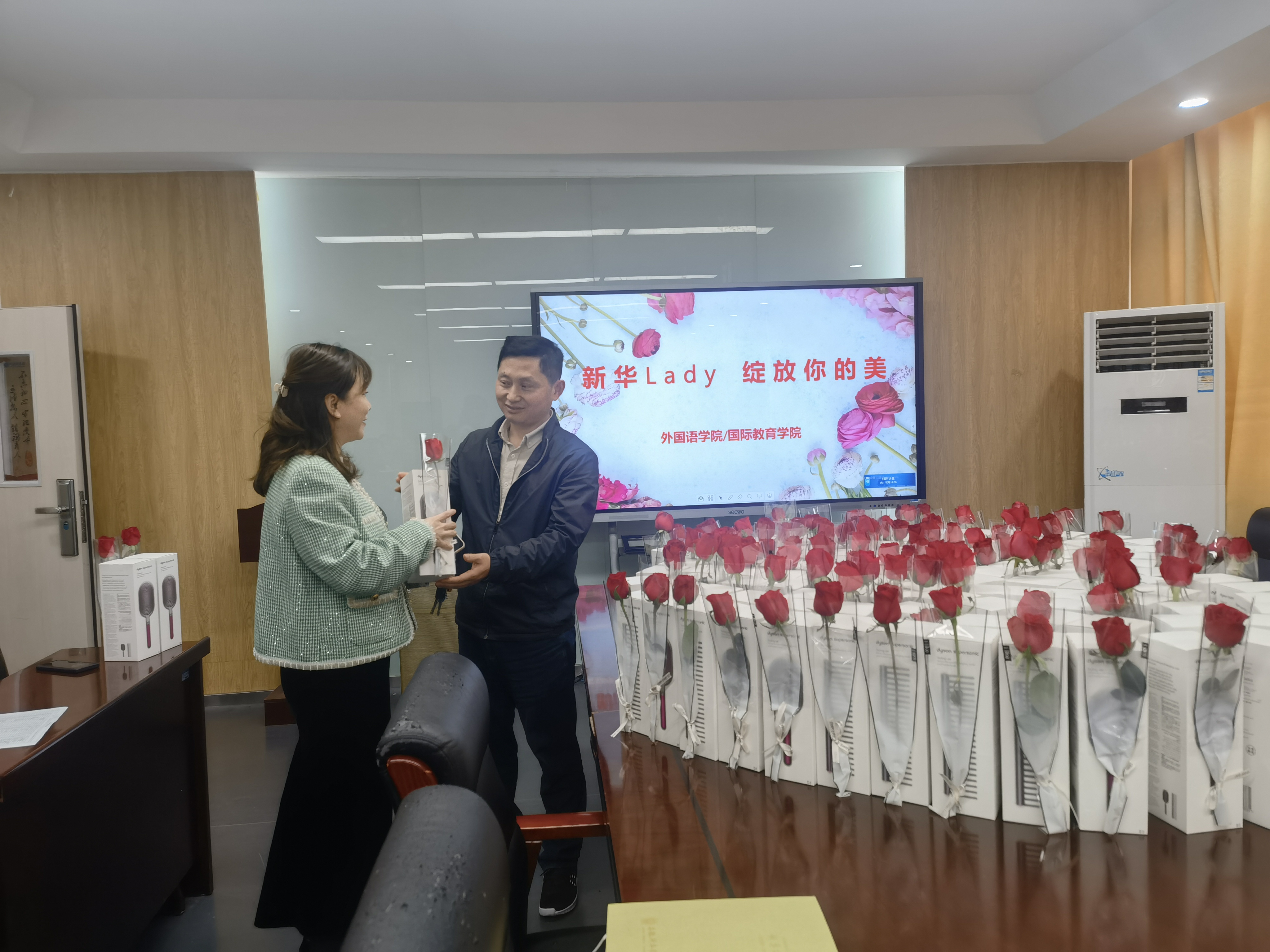 当天清晨,院里组织学生干部为每一名进入教学楼的女教师送上鲜花,为一天的工作传递了好心情。