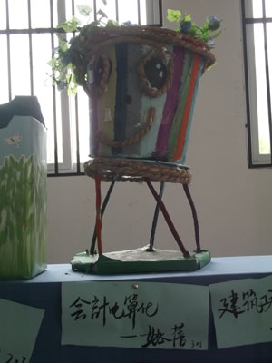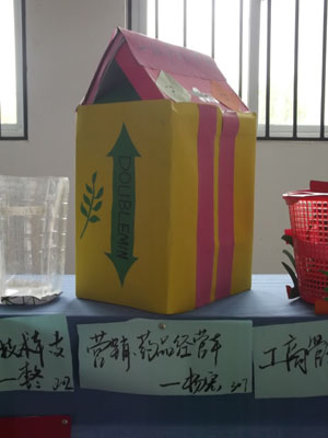 本次设计大赛以“注重节能环保,创建文明高校”为主题,通过利用生活中的废弃物品来制造环保垃圾箱。所展示的垃圾箱主要分为环保型简易垃圾箱和创意型美观垃圾箱,环保型垃圾箱中有的是由铁丝把各类塑料瓶组合成型,有的是用废弃的一次性筷子集扎成箱。创意型垃圾箱中有的是由小铁桶加上废弃木头装成的架子组成,有的是将废弃装修塑料门板组装成“鸟巢”形等,每个垃圾箱的周围都细心地张贴着有关环保的标语标识。