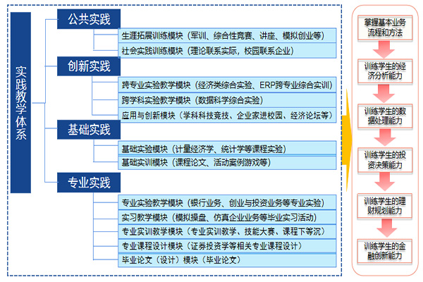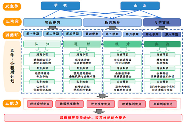 经济与金融专业根据数字经济时代对金融人才的新要求,强化学生经济学理论基础,联动校企双元主体,与国元证券建设财商产业学院;构建“理论夯实、验训联动、习学贯通”的培养路径,制定“汇学·会理财”计划,通过“认知、进级、提升、实战”四级循环层层递进,构建了“双主体、三阶段、四循环、五能力”的人才培养模式。近三年,该专业获批省级卓越金融工程师培养项目、省级一流本科人才示范引领基地、省级校企合作实践教育基地。