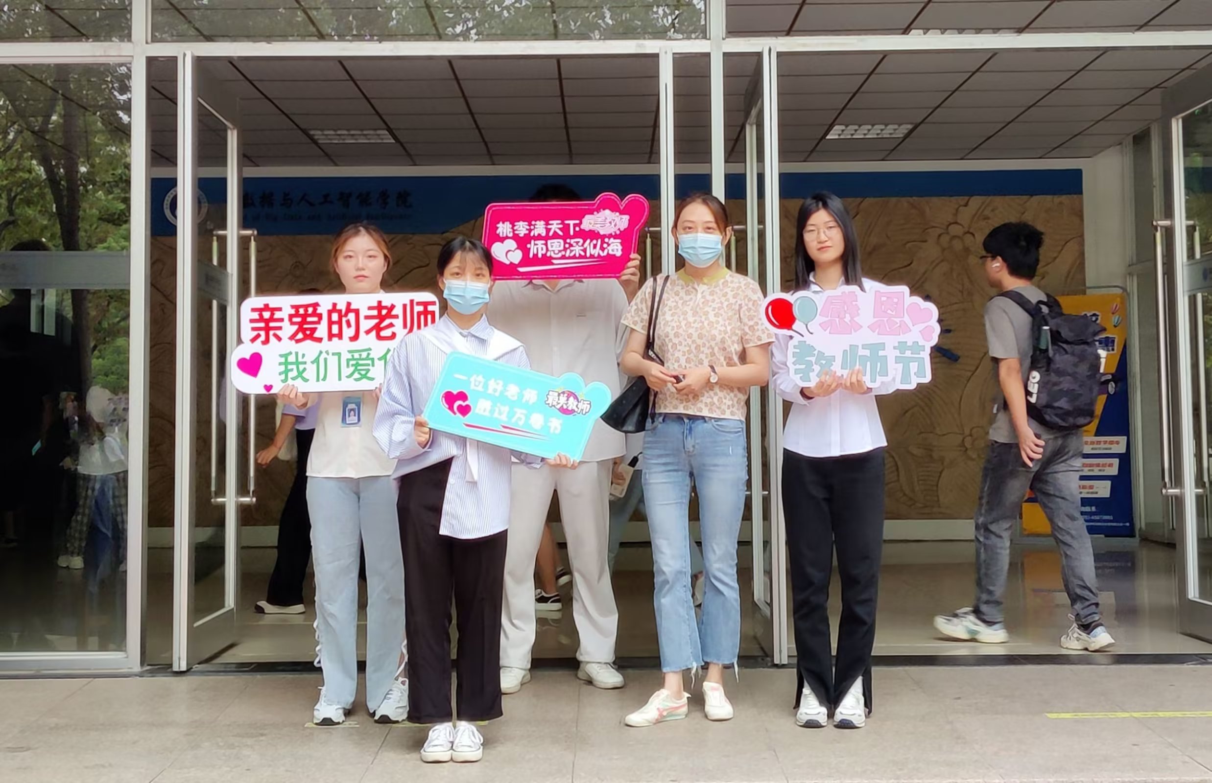上午7时,大数据与人工智能学院院门口装扮一新,学院学子们为教职工们送上节日祝福,并合影留念,以表对老师们的祝福与感恩。
