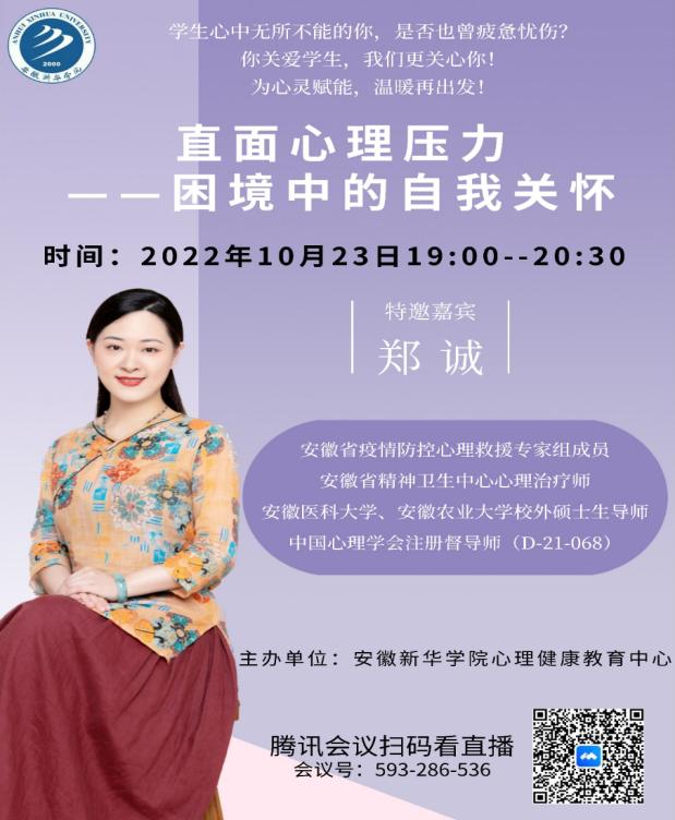 本讯网(通讯员:项钰)10月23日,pp电子心理健康教育中心特邀安徽省疫情防控心理救援专家郑诚教授,进行了以“直面心理压力——困境中的自我关怀”为主题的心理健康“云”讲座,pp电子官方网站教职员工共同线上听课。