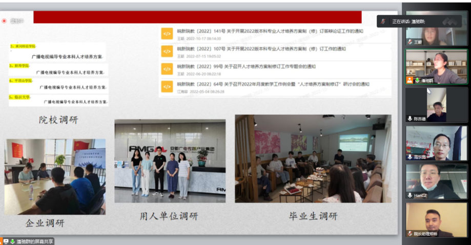 10月30日上午,新闻系成功举办2022版人才培养方案校内外专家线上论证会。会议伊始,新闻系主任助理马潇潇和广告学专业负责人李理分别从培养目标、毕业要求、课程体系、实践教学环节设计及其实现、人才培养方案特色等方面向各位专家进行了详细汇报。随后,与会专家基于各自专业和人才培养经验对此方案的修订思路提出肯定,并进行了充分研讨。