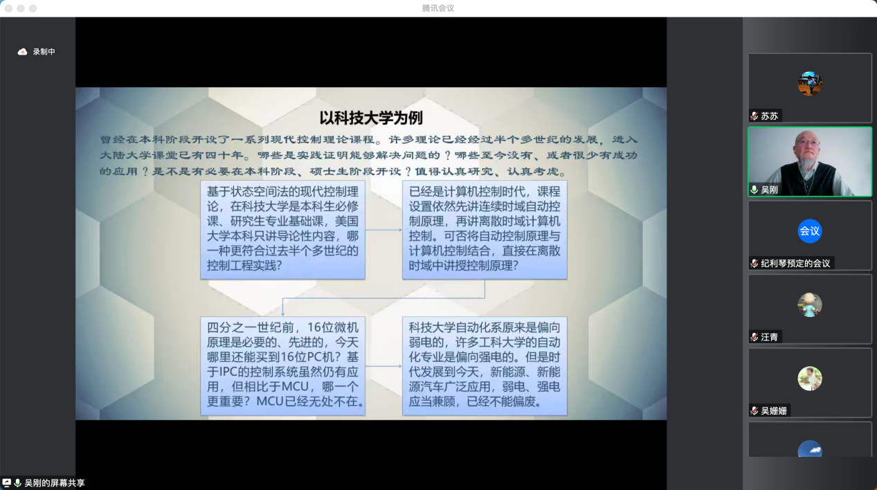 报告结束后,结合自动化一流专业建设,围绕2022版专业人才培养方案,专业教师与吴刚教授一起探讨了课程的设置及教学内容的改革,同时就如何实现自动化专业人才培养的多元融合,如何提升教师教学质量,如何在有限的学分里实现专业基础知识与前沿知识的平衡等问题,与专家进行深入的探讨与交流。