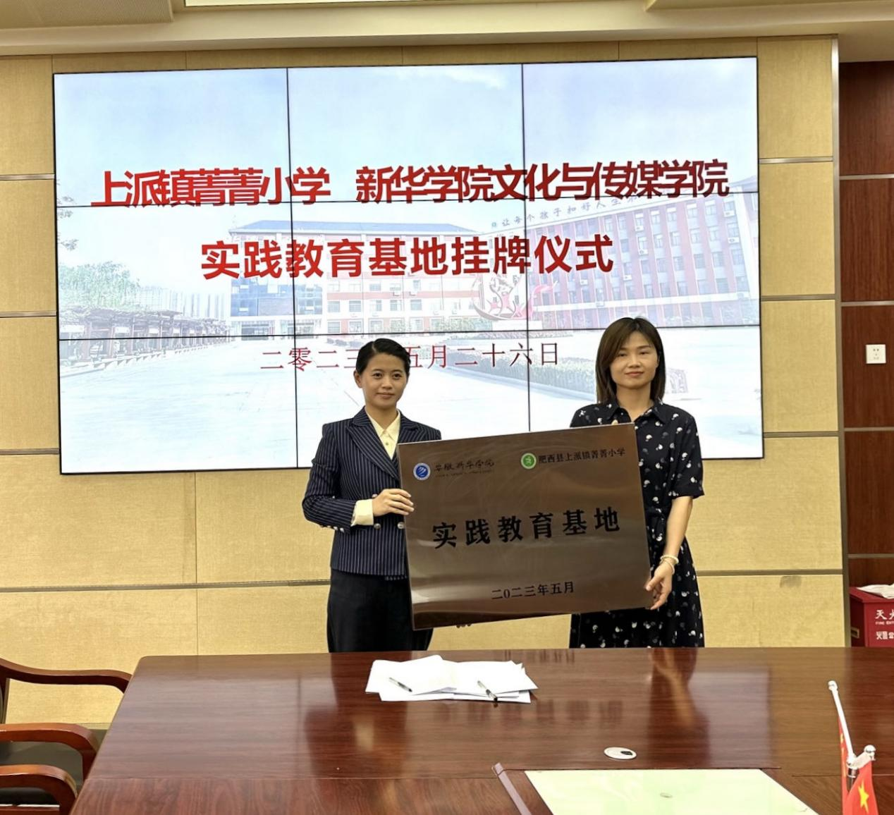 首先吴霞对新华学院文化与传媒学院一行人员的到来表示热烈欢迎,随后介绍菁菁小学近些年发展状况,并表示共建基地响应了教育部大中小学思政课一体化共同体建设思路。洪玉介绍了新华学院文化与传媒学院的发展状况,并从“实习实训”、“协同育人”、“产学研”三个平台对此次实践教育基地的合作提出工作设想。最后,双方就实践教育基地进行了挂牌。