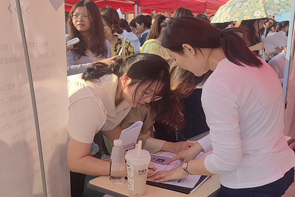 仪式结束后,我院于图书馆南广场为招聘企业和2024届毕业生搭建双选平台,组织了一场大型校园双选会及知名企业专场招聘会。双选会上,招聘企业和毕业生们进行了深入的交流。许多招聘人员表示,他们对我院的毕业生较满意,认为他们具有较扎实的专业知识和良好的综合素质。2020级会计专业的马紫瑄同学参加完招聘会后表示:学院搭建的双选平台涉及专业对口的岗位很多,让大家更好地了解了就业市场和各种职业机会,期望自己能找到合适的工作。招聘会现场,人头攒动,毕业生积极与招聘人员交流,主动了解用人单位情况,现场气氛热烈。