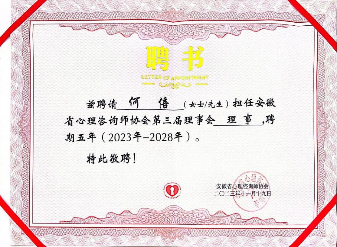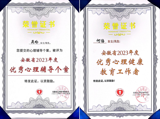 pp电子学生处学生心理健康教育中心获评“安徽省2023年度优秀心理健康教育工作集体”,何倍老师入选“第三届理事会理事”并获评“2023年度优秀心理健康教育工作者”,吴玲老师提交的心理辅导个案被评为“安徽省2023年度优秀心理辅导个案”。