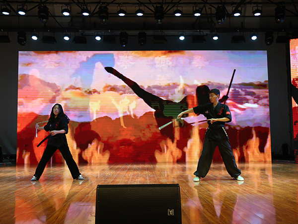 紧接着各种节目轮番登场,异彩纷呈。激情四溢的双截棍表演,每一环都是师生密切合作造就,每一舞都是台下苦练得成。