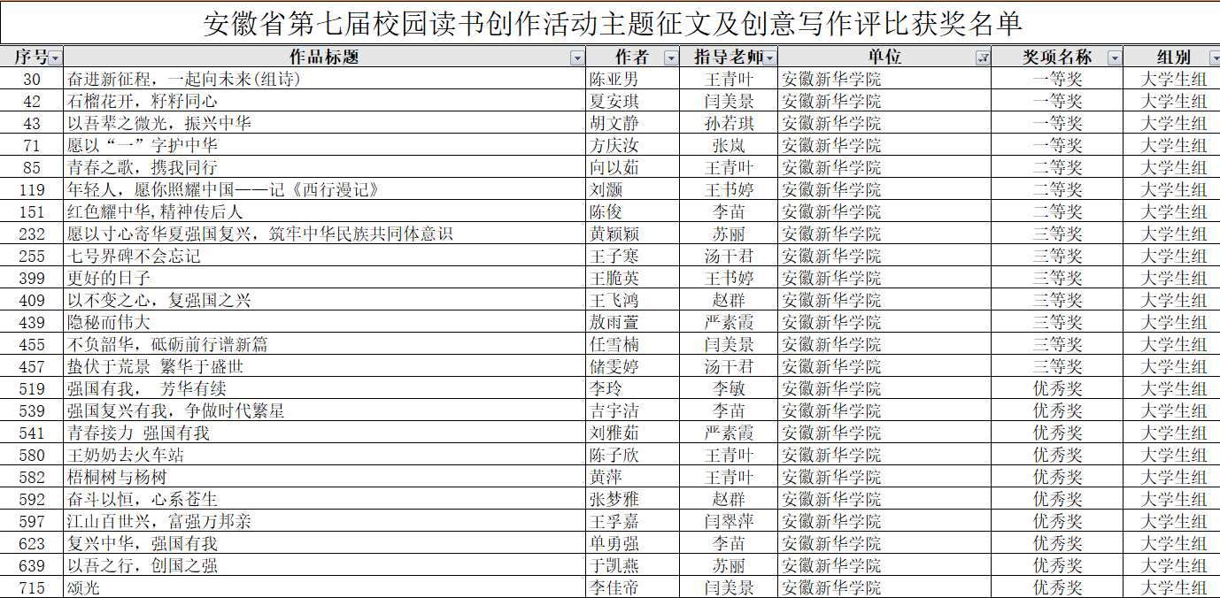 本网讯(通讯员:严素霞)近日,由省委教育工委、省教育厅、省人力资源和社会保障厅、省文化和旅游厅、省新闻出版局、团省委共同主办的安徽省第七届校园读书创作活动落下帷幕,pp电子师生在本次活动中喜获佳绩,获得各类奖项共32项,其中一等奖4项、二等奖5项,三等奖10项,优秀奖13项。获奖名单如下: