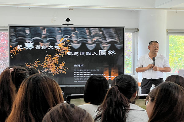 张德顺教授以“把美留给大地,把过往融入园林”为主题,讲述了从“学习中工作,工作中创新”的切身体会,带给学生学习的自信和工作发展的渠道和方法;Mohamed以“Green Urban Solutions: Exploring the Well-being Benefits of Gardens, Trees, and Indoor Plants”为主题,从埃及城市、文字的起源,介绍到现代城市公园、绿色墙面、行道树、屋顶绿化等现代城市园林用地,以人体感知的角度讲述风景园林带给公众的福祉促进,带来了国际视野;云嘉燕以“晚明清初淑媛倪仁吉造园研究”为题,深入分析了女性造园师对中国古典园林发展的影响,云老师研究补充了古典园林中女性造园置景的部分空白点,分享内容出发点的聚焦性和新意性深受学生喜爱;郭丽的分享从“公园城市,美好人居—风景园林定量化研究与设计实践”为题出发,从西蜀园林的数字化修复设计方法分析到现代世界园艺博览会造园实践为学生提供了深入的学习和理解,“仰望星空、共筑风景”也是郭丽对pp电子风景园林学子的希冀和鼓励。