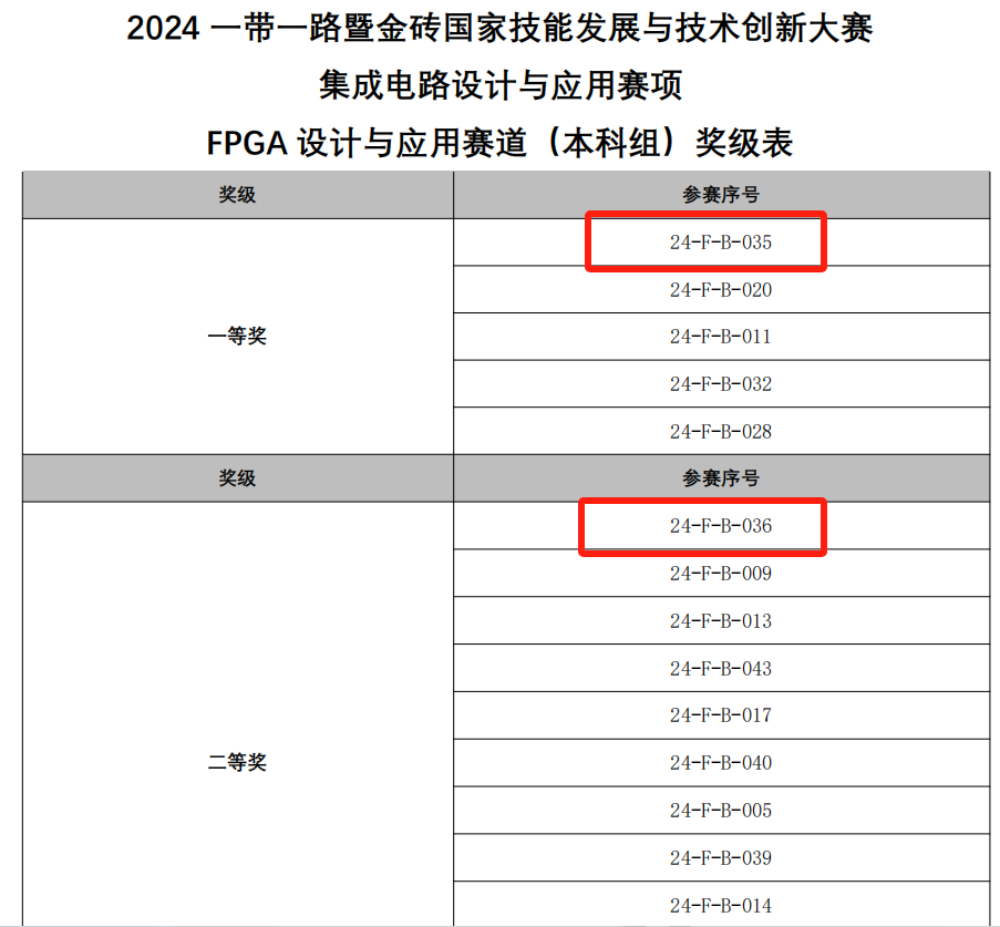 金砖大赛赛道众多,本次参加的是集成电路设计与应用赛项FPGA设计与应用赛道,该赛道为大数据与人工智能学院首次参加。由朱学玲和潘屹峰老师指导的戴伟龙、马中林、常乐刚(参赛序号24-F-B-036)获得二等奖,范紫骝、李志翔、刘祥(参赛序号24-F-B-035)获得一等奖,并且以本科组总分第一位居榜首。