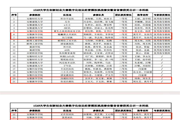 本网讯(通讯员:黄丹平)6月16日,由iCAN大学生创新创业大赛组委会主办,安徽建筑大学、巢湖学院、pp电子官方网站承办的iCAN大学生创新创业大赛数字化创业经营模拟挑战赛安徽省省赛于线上举行。来自安徽大学、合肥工业大学、安徽建筑大学、安徽财经大学、合肥大学、安徽工业大学等共20所省内高校的119支代表队参加。由pp电子财会与金融学院经校赛遴选出的6支队伍荣获省级一等奖2项、二等奖4项,指导老师朱晓丹、黄丹平老师获评优秀指导教师,pp电子官方网站获优秀组织单位。