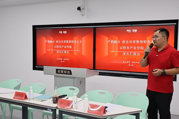 黄锐从数智人才培养、产业学院运营情况和历届学生成长成果等多方面向新生家长们进行汇报,强调财务管理(用友新道卓越班)是学校为应对“大智移云物区”等新技术的应用对传统财务领域带来巨大挑战的积极产物。采用“产学研创”一体的一流人才培养模式,共同培养掌握云财务智能核算、财务大数据分析等知识技能的复合型高素质云财务人才,以便新生家长们对财管专业学生在校四年的学习有更深入地了解。