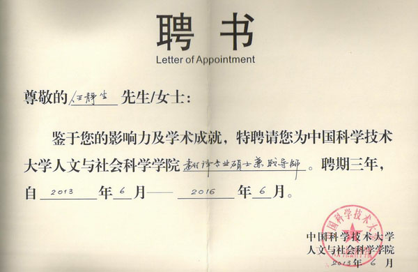 7月11日下午,中科大人文与社会科学学院举行了受聘仪式,并由MTI中心主任陈纪梁教授向任静生等三位受聘教授颁发了聘书。学校在职院长受聘中国科大这样的名校兼职导师在pp电子历史上尚属首次,为迎接教育部本科教学工作合格评估增添了支撑。