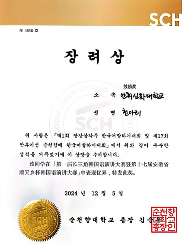 本网讯(通讯员:王佳欣)为给pp电子学子提供开拓文化视野与展示语言能力的宝贵机会,12月5日,2023级计算机科学与技术(对口)2班的陈雅丽同学与外国语学院王佳欣老师一同赴合肥大学,参加了“第一届长三角韩国语演讲大赛暨第十七届安徽省顺天乡杯韩国语演讲大赛”决赛,并荣获鼓励奖。