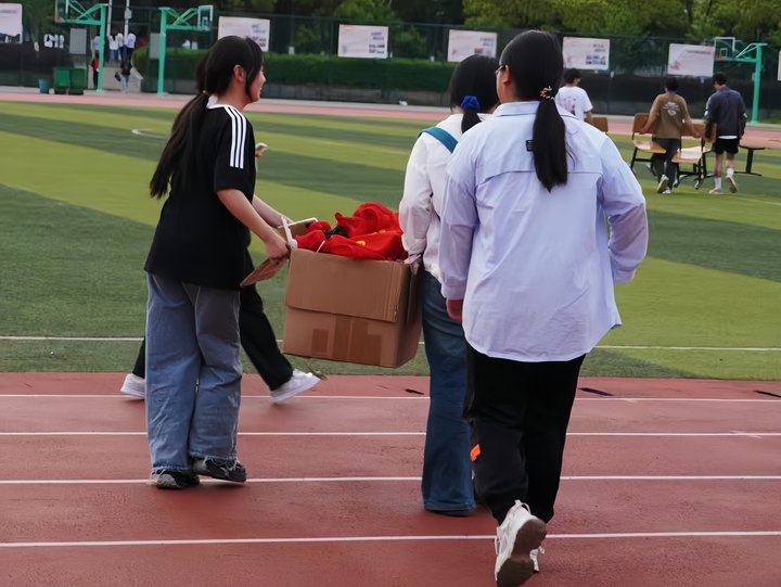 24 新闻本 1 班的张滢身兼运动员与志愿者,上午参加完女子八百米比赛,下午便投身参与教职工实心球项目的现场维护:“虽然没获奖,但我为实心球比赛的顺利进行贡献了力量,也传递了志愿者的精神。”