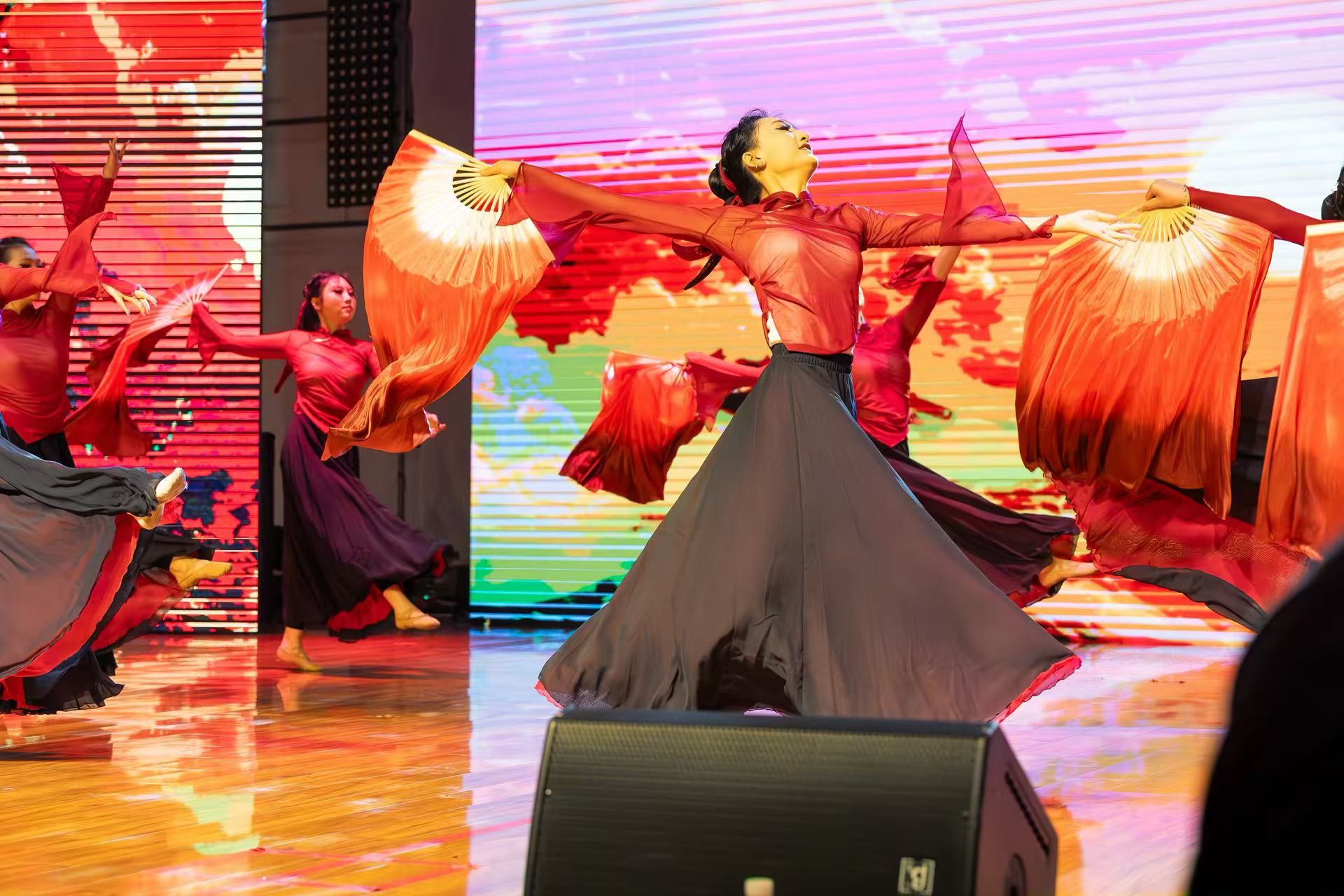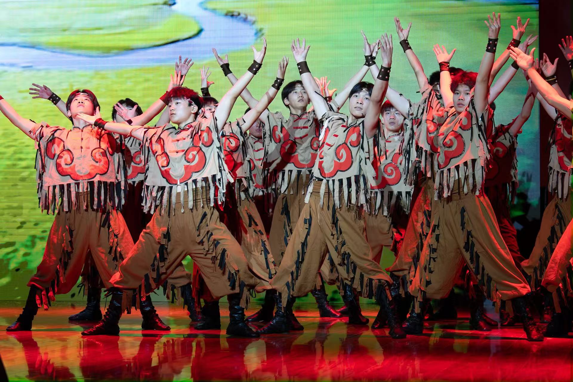 中国古典舞《九州同》以翩跹的舞姿勾勒神州大地的壮美山河,用刚柔并济的肢体语言,诉说五十六个民族血脉相连的深情厚谊。街舞《Black》的动作如机械齿轮般精准咬合,整齐划一的律动中喷薄着蓬勃力量,每一个挥臂、踢腿都带着热血贲张的张力,仿佛用身体在舞台上书写一曲关于协作与爆发力的铿锵乐章。
