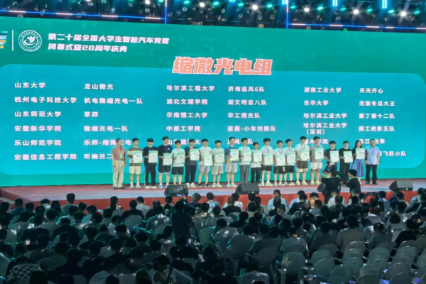 本网讯(通讯员:乔红娇)近日,2025年第二十届全国大学生智能汽车竞赛全国总决赛在浙江杭州电子科技大学体育馆圆满落幕。由电子工程学院/智能制造学院乔红娇、史道玲和李红星三位指导老师共同指导郑天乐、郝鸿宝和周昕组成的缩微光电组(安徽区域赛省冠)和唐诚威、谢邦元、杨沈锐、印邦阳和张一凡组成的双车跟随组参加了本次全国总决赛。经过激烈地角逐,两支队伍表现卓越,双双荣获全国总决赛一等奖,其中缩微光电组跻身全国前四强。