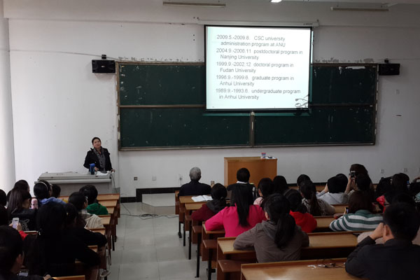 讲座共分为引言﹑问题提出﹑现状﹑原因分析﹑对策和结束语六个部分。胡健教授以京师同文馆的创办作为引言,指出中国文化“走出去”需要新的传播策略;现行我国英语专业课程设置的软肋,以及英语专业教师和学生所普遍面临的各种问题;阐述了现行英语专业人才培养的现状,主要表现为英语专业盲目扩张,教学质量下降,且人才培养重语言,轻文化。她分别从学校、教师和学生三个层面作了深层次的原因分析,指出根源在于西方文化输入意识偏强,忽视了母语文化的积极作用;并现场和大家探讨了应对策略,提出应从思想观念、课程设置、教学内容和教学方法等方面做积极的改革。