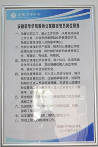 经过暑期的全面改造,焕然一新的教师公寓显得宽敞明亮,公寓接待大厅及各楼层走廊随处可见映衬着校园风光的名句箴言,师德师风和大学文化蕴含其中。为加强住宿教师信息管理,方便住宿教师之间工作与生活的交流和联系,目前两栋教师公寓楼已统一制作了门牌信息卡。《教师公寓楼员工住宿须知》、《教师公寓楼宿管员岗位职责》、公告栏、接待登记桌及信息板的设置让教师公寓的管理服务更加公开、透明。