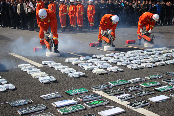 在假冒伪劣消防产品集中销毁仪式上,一大批假冒消防应急照明、灭火器、防火门、消防水带、疏散指示标志等伪劣产品被消防队员碾碎切割。2011级土木工程5班的蔡莹莹同学说:“这些消防器材本是为了人们的生命安全,可这些不合格的非但不能保护,更可能起反作用。”