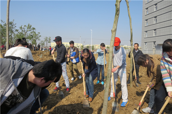 随后,全体参与人员在现场工作人员的带领下,一起学习了种植的要领。大家三个一群、两个一组,有的挖坑,有的扶苗,有的培土,植树现场一派热火朝天的景象。参与人员不顾一身土,一身汗,经过了近一个小时的辛勤劳动,种植了近三十棵树苗,洒下了一片绿的希望。