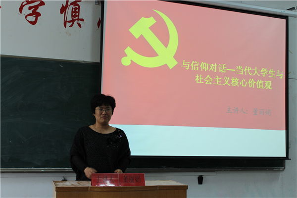 董丽娟提出社会主义核心价值观是由社会主义核心价值体系发展和衍生而来。社会主义核心价值观在国家层面提出了富强、民主、文明、和谐的价值目标;在社会层面提出了自由、平等、公正、法治的价值取向;在个人层面提出了爱国、敬业、诚信、友善的价值准则。然后她从培育和践行社会主义核心价值观的重大意义、深刻领会“三个倡导”的科学内涵、要做社会主义核心价值观积极践行者等三个方面进行了详细解读。董丽娟结合青马班学员的群体特征,从过硬的思想素质、饱满的生活激情、浓厚的精英情结、蓬勃的青春朝气、博爱的奉献精神、独立的正直人格等六个方面阐述了学生干部如何践行社会主义核心价值观。