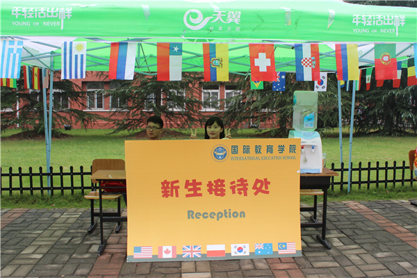 国际教育学院悉心在院内走廊设立了入学照片墙,为第一天踏入大学校园的新生们和陪伴他们一路成长的父母记录下这难忘的一刻。在新生接待处,国际教育学院师生特别制作了各国国旗悬挂在展台四周,连指示牌字体等细节处也用心设计,独具风格,体现了该院的国际化培养特色。
