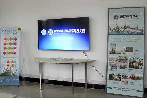 为了让新生和家长深入了解国际教育学院的办学特色,更快的帮助新生融入新的环境,国教院在休息室内循环播放形象片和国外大学的宣传片,展现了中外合作办学的浓厚氛围。