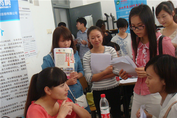 本网讯(陈敏、焦婧)10月10号下午,药学院举办2015届毕业生专场招聘会。参加此次招聘会的有安徽百姓缘大药房,安徽安科生物工程股份有限公司和安徽国安医药有限责任公司等15家单位,药学院200多学子到现场咨并参加面试。