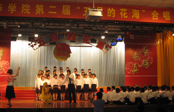 “九十一年峥嵘岁月,九十一年青春飞扬”。5月24日晚,学校大礼堂内歌声嘹亮,由校团委主办的纪念五四运动九十一周年的“五月的花海”大合唱比赛在这里隆重举行,来自全校各个二级学院的10支代表队参加了此次合唱比赛,经过角逐,我院摘得桂冠。