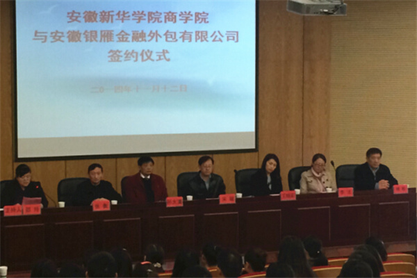 本网讯(通讯员 杨兆亮)11月12日上午,商学院与安徽银雁外包有限公司签约暨揭牌仪式在多功能报告厅举行。商学院院长孙太清教授,教学副院长张衡教授、徐松教授,行政副院长邵玲,学生处副处长李洁,安徽银雁外包有限公司总经理宋键,人事经理王晓莉出席本次签约揭牌仪式。