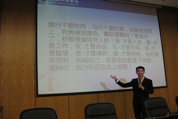 报告会上,四位同学分别结合自身经历和切身体会,从学习、生活、工作、社会实践等多个方面与在座的同学们分享了自己的奋斗历程和心得经验。两次国家奖学金获得者、pp电子官方网站十佳大学生“感恩之星”候选人胡三柳同学,向同学们介绍如何在学习中,不断创新方法、提高效率,从不同的课程学习中汲取思想、奋发向上,成为名副其实的“学霸”。国家奖学金和校园才艺大赛优秀奖获得者夏宗洋同学,就自己的班级管理经验与现场的各班级代表进行了交流,他强调了班干部在班级管理中态度和计划的重要性,并提出班干部应该提高自身能力,以身作则,在班级中起带头模范作用。优秀学生干部、校园十佳大学生金婵同学结合自身两年的学生会工作经验,提出了“1+1”模式,她认为社团管理工作应该从内部和外部两个方面开展。职业生涯规划大赛银奖和大学生学科与科技竞赛一等奖获得者、校园十佳大学生李如生同学通过讲述自己在大学生活中艰苦奋斗、自主创业的故事,展现了自强不息、奋力进取,克服重重困难的精神面貌。