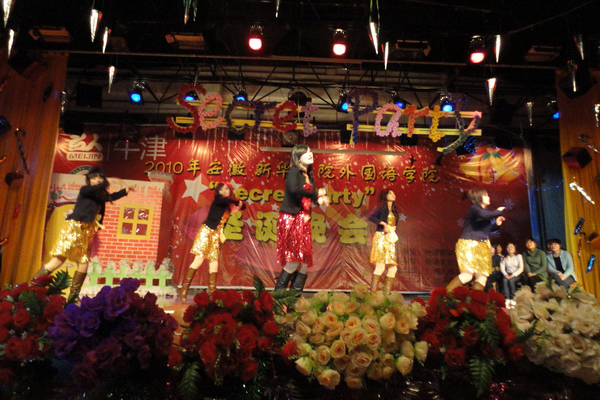 在两个多小时的精彩演出里,丰富多彩的节目让观众们目不暇接,晚会现场到处充溢着欢乐和幸福的味道。《If you seek Amy》《快乐出发》《歌舞青春》等炫丽多姿的舞蹈划出优美华丽的弧线;《君か好きたと叫ひたい》《海阔天空》等风格多变的歌曲唱出圣诞华美的篇章;《王子争夺战》等幽默风趣的话剧和新颖别致的相声演出诙谐欢快的滋味;《洞庭新歌》《青花瓷》等优雅的乐器演奏奏出婉转悠扬的音符。多才多艺的老师们也在台上将激情挥洒了一番,由彭洪磊老师和芮萍老师深情合唱的《在我生命中的每一天》赢得了满场喝彩。外教Julius热情奔放的歌舞更让整场晚会掀起了高潮。整个会场就这样一直沉浸在这祥和美好的氛围中。精彩节目、互动游戏一个接一个,无不将大学生的活力展现得淋漓尽致。在主持人娓娓的祝福里,在观众们意犹未尽的微笑和雷鸣般的掌声里,这样一场华丽的视听盛宴完美地落下帷幕。