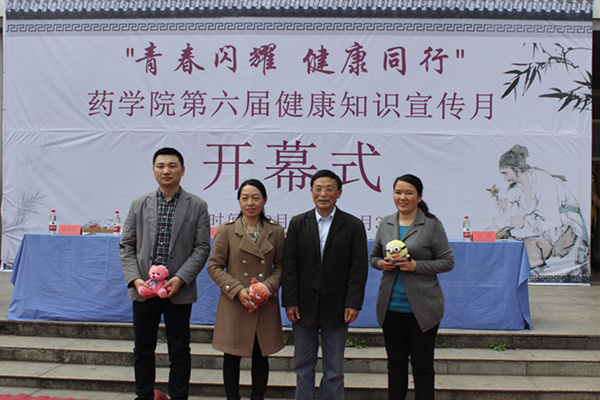 开幕式在火爆的街舞串烧中拉开序幕,院长张国升隆重宣布药学院第六届健康知识宣传月活动正式开幕。副院长余立新致开幕词,她向参加活动的同学和老师介绍了此次活动的内容并对出席开幕式的领导和嘉宾表示热烈欢迎,对支持本次活动的师生表示衷心感谢。本次活动为系列活动,内容丰富多彩,包括义务献血、中药材展示、花茶品茗、人体模型展示、药学院新生班女子篮球赛、“健康同行”万人签名活动以及养生知识宣传讲座等。随后,王丽助理对药学院健康知识宣传月活动表示肯定,希望各院领导、老师以此次健康宣传为契机,高度重视大学生健康问题。最后,药学院领导向主席台嘉宾赠送香囊并合影留念。