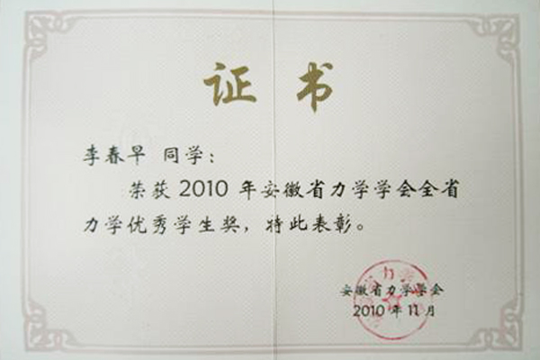 在2010年安徽省力学学会优秀学生评选活动中,土木与环境工程学院2009级土木工程(1)班的李春早同学喜获这一荣誉称号。据悉,这也是土木学院学子首次在相关专业技能方面获得的殊荣。