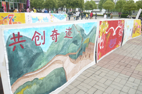 阵阵激情而又动感的音乐在翰林广场回响,大家纷纷驻足关注。广场上一幅幅色彩缤纷、精美而又富含寓意的板报及周年庆典图片吸引了往来学生的注意力。其中2010级国际经济与贸易2班的板报以其鲜艳夺目的红色为底色,两旁盛放夺目的烟火为基调,意在商学院七周年庆典万众期待。往来的行人在欣赏完一幅幅精美的板报及往年的周年庆典图片展后,都纷纷称好,并纷纷向在场工作人员打听晚会的具体举办时间。