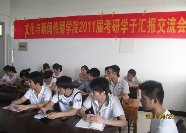 5月20日下午,文化与新闻传播学院召开考研学子经验交流会,朱小龙等4名今年考取硕士研究生的2007级学子耐心地为20多名有考研意向的学弟学妹解读各高校考研政策,分享交流考研心得。