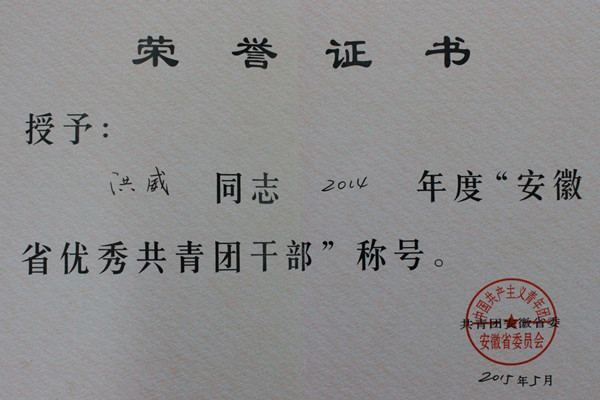 pp电子洪威老师荣获2014年度“安徽省优秀共青团干部”荣誉称号