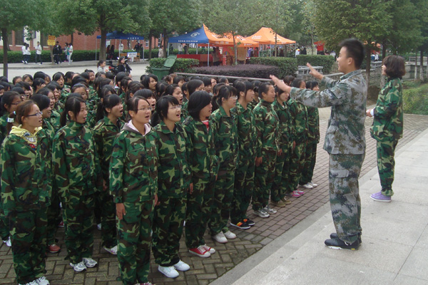 气温依然高居,训练场上的激情不减。树荫下,教官和新生相携,高唱军歌。几个连之间更是进行着气势磅礴的拉歌比赛。欢笑声连绵起伏,大家似乎早已忘记了累与痛。这些动人的弦律,成为初秋的校园最靓丽的风景线!