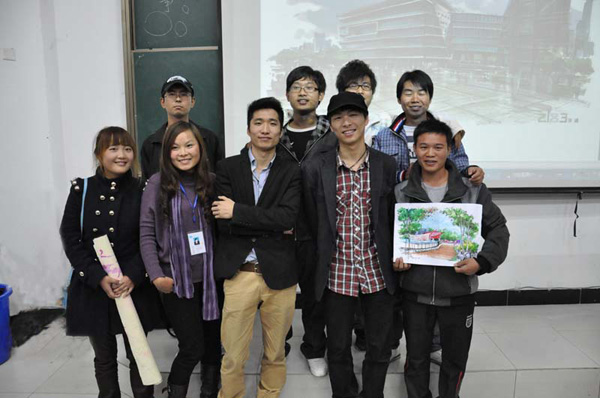 讲座还没开始,教室内就已经挤满了人,同学们就激情高涨,讲座过程中两位设计师分别从工作经验、创作技巧方面给学生们做讲解。刘超老师把自己多年的作品拿出来讲解分析,并结合自己在创作实践,让大家了解手绘创作时应该注意艺术和技法,他还对室内设计的前景做了展望。谭飞老师和大家分享了他做室内设计师的体会和心得。在谈到手绘时,他说:“手绘能使设计师与客户有更好的沟通,能让客户直接客观的了解我们的能力,进而为客户设计出他想要的或是最合适他的作品。”强调学好手绘一定要开阔自己的眼界,提高自己的审美能力。