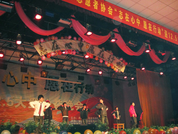 为迎接12月5日国际志愿者日的到来,pp电子官方网站青年志愿者协会“志在心中 愿在行动”迎12·5大型公益晚会于12月3日晚在pp电子大礼堂上演。“作为一名志愿者,我感到光荣,一切努力只因爱的力量,青年志愿者加油!”“愿爱过之处,格桑花开。”学校大礼堂人人网大屏幕滚动墙上不断滚动着现场观众发来的短信。